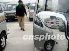 山東煙臺十月期間舉行車展,其中五萬元左右的面包車很受農民關注.作者:張宇