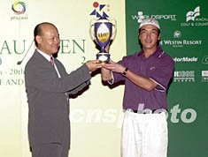 “2002澳門高爾夫球公開賽”二十日結束比賽,中國選手張連偉成功衛冕,獲得該賽事冠軍。圖為澳門體育發展局局長肖威利向張連偉頒發獎杯李剛 攝