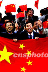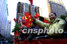 22日,旅美華人華僑匯聚在芝加哥市中心里茲酒店前,在秋風中揮舞國旗,熱烈歡迎中國國家主席江澤民首次訪問芝加哥。作者:王瑤