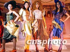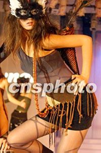 2002年中國(guó)義烏國(guó)際小商品博覽會(huì)二十三日在浙江義烏市舉行,中外客商云集,精品薈萃。中國(guó)著名襪業(yè)品牌“夢(mèng)娜”有限公司在博覽會(huì)上推出中國(guó)首場(chǎng)腿部時(shí)裝秀,圖為戴面具的模特展示精美襪裝。作者:錢興強(qiáng)
