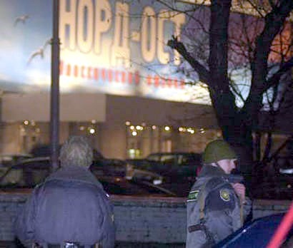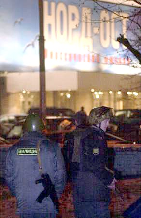 莫斯科時間23日晚間(北京時間24日凌晨),大約40-50名車臣武裝分子劫持了莫斯科市一家劇院,將700多人扣為人質,已經釋放部分人質。圖為警察在劇院外警戒。(春風)