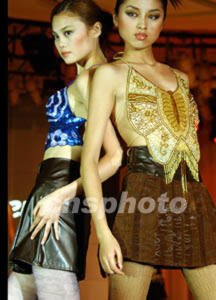 2002年中國義烏國際小商品博覽會日前在浙江義烏市舉行,中外客商云集、精品薈萃,中國著名襪業品牌“夢娜”有限公司在博覽會上推出中國首場腿部時裝秀。圖為模特向中外客商展示精美襪裝。作者:錢興強