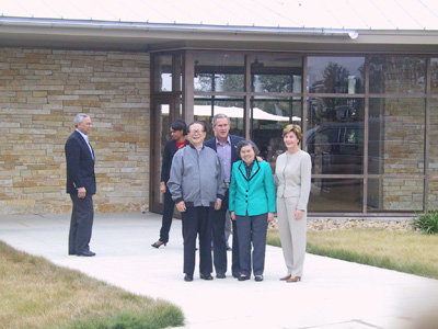 當江澤民和夫人王冶坪乘專車抵達牧場正門口時,提早迎候在那里的布什總統和夫人勞拉走向前去,與江澤民夫婦熱情握手。布什說,這個牧場是我溫暖的家,我和勞拉非常高興在家里接待你和王冶坪女士。