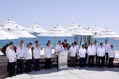 記者看到,上午八時半左右,墨西哥總統(tǒng)福克斯即在會場外一一迎候與會者。九時許,按APEC傳統(tǒng),與會領(lǐng)導人和代表著東道主提供的特色民族服裝拍攝“全家福”。與上屆上海峰會的中式唐裝相比,今天的“瓜亞貝拉”同樣極有“個性”,它是墨西哥東南部流行的一種傳統(tǒng)服裝,為精一色的白色,有四個胸袋。合照背景為太平洋碧藍的大海,藍白相襯,在美麗的洛斯卡沃斯留下了一道亮麗的風景線。