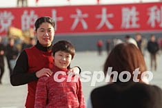 十一月五日,北京天安門廣場完成了配合“十六大”召開而進行的新布置。一對母女興致勃勃地與巨型“十六大”標語合影留念。作者:張煒