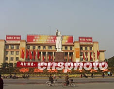 四川省會(huì)成都盛裝喜慶中共“十六大”召開,鮮花簇?fù)碓谔旄畯V場(chǎng)毛澤東像前。作者:肖龍聯(lián)
