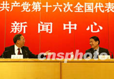 中國國家發展計劃委員會主任曾培炎(左)和國家經貿委主任李榮融十日成為中共十六大新聞中心舉行的記者招待會新聞人物。作者:毛建軍