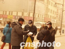 長春市天空一片暗黃,市民紛紛購買口罩以避風沙。韓丹 攝