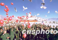 武警西藏總隊官兵在拉薩布達拉宮廣場打起威風鑼鼓,放飛和平鴿和紅汽球,熱烈慶祝中共十六大召開。作者:趙艷志