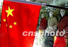十一月的北京街頭為中共十六大召開遍掛國旗,紅光映照著時裝店的模特。作者:賈國榮