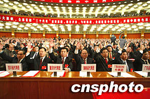 中國共產黨第十六次全國代表大會十四日上午在北京人民大會堂閉幕,主席臺上下舉手表決通過關于十五屆中央委員會報告等決議。中新社記者 毛建軍 攝