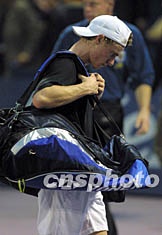 上海十三日晚結(jié)束的大師杯小組賽可謂冷門迭起,繼阿加西慘敗后,頭號種子休伊特又以0比2輸給了狀態(tài)正佳的西班牙老將莫亞,小組出線形勢不容樂觀。圖為休伊特賽后黯然離場。作者:湯彥俊