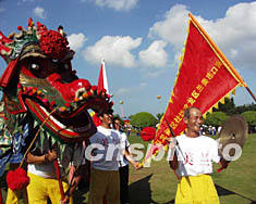 ?谑辛f市民十四日在萬綠園慶祝集會,?诿捞m區龍文坊社區的六十歲老者舞動珍藏八十年的彩龍,歡慶中共十六大閉幕。作者:王辛莉
