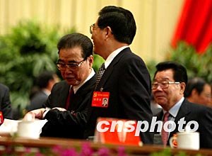 賈慶林和黃菊十四日在北京出席中共十六大的閉幕會。作者:毛建軍