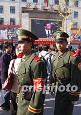 十一月十五日上午,成百上千的行人聚集在北京王府井街頭,觀看新一屆中共中央政治局常委首次亮相的電視直播,兩名武警戰(zhàn)士在街頭巡邏維護(hù)秩序。作者:張煒
