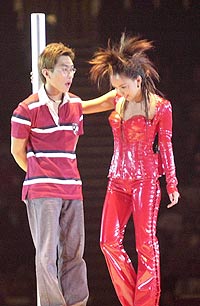那名嚼著口香糖上臺的男歌迷,被阿妹兩名女舞蹈員“點中”上臺后,雙手就被綁在舞臺中間的一根柱子上,面對一身紅艷艷貼身衣褲裝的阿妹“誘惑”,男歌迷的“定力”似乎是太好了,反而是臺下的觀眾,不知是羨慕男歌迷,還是被阿妹的性感挑逗給“刺激”得不停高喊和尖叫。