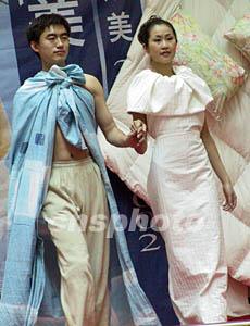 二十日,北京王府井的一家商場內(nèi),模特穿著用被子和床單制作的婚紗進行表演,為該品牌的床上用品促銷。作者:盛佳鵬