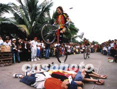 第三屆中國海南島歡樂節開幕式日前在?诼≈嘏e行,來自島內外的中外游人近8萬參加了游園與聯歡。圖為飛車表演。作者:蔣聚榮