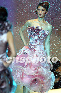 模特二十四日在中國國際時裝周上展示“歐柏蘭奴”總設計師羅崢2003春夏時裝,如同綻放在雪中的花朵。羅崢的作品大量而巧妙地運用立體剪裁技術,使人體會到美侖美奐的感受。作者:毛建軍