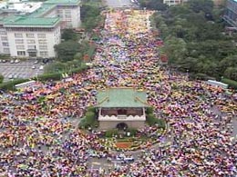 示威游行的宣傳車播送著《天黑黑》﹑《補破網(wǎng)》等歌曲﹐以及“阿公要煮咸﹐阿扁要煮淡”的歌聲﹐令年邁的示威者聽了格外傷感。