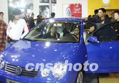 上海大眾產(chǎn)的轎車吸引消費(fèi)者目光,圖為母女倆正在試車。