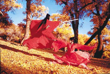 中新網11月27日電 張曼玉在電影《英雄》中除了跟梁朝偉于九寨溝瀑布前比劍外,還跟章子怡在內蒙古一處遍地黃葉的胡楊林中比武。雖然誰勝誰負,要在電影中才有分曉,但單論畫面,意境就極之凄美。