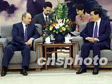 胡錦濤首先對普京的來訪表示熱烈歡迎。他說,值中國共產(chǎn)黨十六大召開不久在北京與總統(tǒng)閣下再次見面感到非常高興。去年十月,他應(yīng)邀訪問俄羅斯,總統(tǒng)閣下關(guān)于國際形勢等問題的見解給他留下很深印象。那次訪問時(shí)間雖短,但情形仍“歷歷在目、記憶猶新”。
