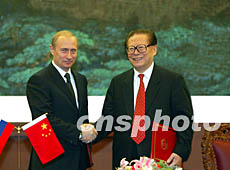 2000年7月,普京總統(tǒng)首次訪華。江主席向普京總統(tǒng)提出,為了確保中俄兩國(guó)和兩國(guó)人民世代友好、永不為敵,我愿與你共同簽署一個(gè)確定雙邊關(guān)系長(zhǎng)期發(fā)展原則與方向的《中俄睦鄰友好合作條約》。普京總統(tǒng)對(duì)此積極響應(yīng)。根據(jù)兩國(guó)元首的指示,雙方外交部門(mén)很快就條約文本達(dá)成一致。條約由兩國(guó)元首在江主席2001年7月訪俄時(shí)順利簽署。
