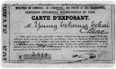 這張編號為2819的參展證正面,是顧永保的照片,還印有1900的字樣;背面上端的法文是:“貿易部、工業部、郵電通訊部1900年國際全球展覽”;參展者名字處是“永珍齋”的拼音,另起一行是法文“中國”,再下面則是三條參展的規定。