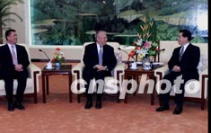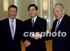 中國國家副主席胡錦濤十一日在北京會見來京述職的香港特別行政區(qū)行政長官董建華和澳門特別行政區(qū)行政長官何厚鏵。作者:鄭萍萍