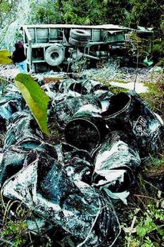前天1時50分,一輛車牌號為桂GA1416的解放牌平頭大貨車在金秀瑤族自治縣七建鄉至三角鄉途中翻下約60米高的山坡,滑下金秀河道。車上載著的100桶共20噸三氧化二砷(俗稱砒霜),有33桶跌入河道,其中30桶不同程度破損,少量砒霜散落河水中,其余67桶翻在山坡上。目前,此事已經上報中央和國務院,中央政治局常委、國務院副總理吳邦國要求迅速妥善處理好此事。