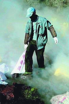 民工灑石灰稀釋河水。(《南國早報》供圖)