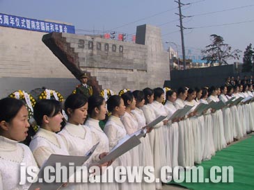 中新江蘇網(wǎng)12月13日電 (記者 王國安)今天上午,侵華日軍南京大屠殺遇難同胞紀(jì)念館的悼念廣場上響起“和平之聲”——在這里參加“悼念南京大屠殺三十萬同胞遇難六十五周年儀式暨南京國際和平集會”的三千名各界人士齊聲高唱《五月的鮮花》、《紫金草,和平的花》、《和平頌》,用歌聲表達了呼喚和平、維護和平、熱愛和平、促進發(fā)展的強烈愿望。