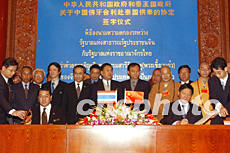 泰王國政府外交部長素拉杰(左)與中國宗教局局長葉小文(右),十四日下午在北京醇親王府簽署“中國政府和泰王國政府關于中國佛牙舍利赴泰國供奉協定”書。北京西郊靈光寺佛牙舍利十五日將由葉小文局長帶領的中國護送團護送至泰國供奉76天。作者:鄒憲