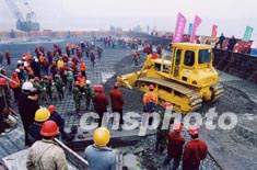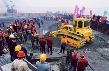 十二月十六日三峽工程三期碾壓混凝土圍堰工程首倉混凝土開始澆筑。這是實(shí)現(xiàn)三峽工程蓄水、通航、發(fā)電的關(guān)鍵性工程。作者:孫榮剛