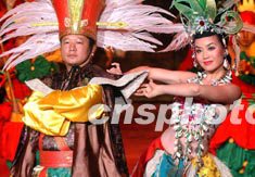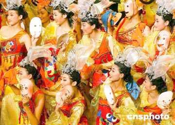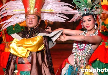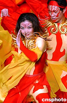 中央電視臺與深圳錦繡中華合作的2003元旦晚會《龍鳳中華》十二月十六日晚在深圳中國民俗文化村新落成的鳳凰廣場推出彩排活動,《龍鳳中華》演繹中國古老文化和民俗風情,場面宏大、氣勢磅礴。中新社傳真 錢興強 攝