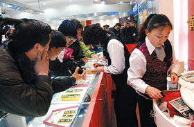 在北京菜百商場,長龍般的隊伍一直在排隊購買小金條,商場售貨人員也認(rèn)為貨估計很快就會銷售一空。而菜百公司獨家推出的“羊年賀歲”金條是所有購買者的關(guān)注熱點,顧客的購買金額最高達(dá)到了10萬元,這也是北京地區(qū)惟一能夠買到“羊年賀歲”金條的商場。