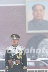 中國武警戰士二十三日在北京天安門廣場冒雪值勤。北京持續降雪的時間已經一周。作者:滿會喬