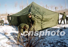 駐守東北地區的解放軍部隊,十二月冒嚴寒在草原腹地進行野外演練。圖為部隊在雪地快速搭建指揮所。作者:馬檣