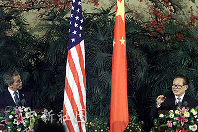 國家主席江澤民與美國總統布什二十一日在北京共同會見中外記者,這是繼APEC上海峰會以來兩國元首第二次共同會見記者。作者:滿會喬
