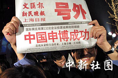 三日晚,在摩納哥夢特卡洛舉行的國際展覽局第132次會議上,中國上海通過激烈竟爭獲得2010年世界博覽會主辦權,當中國申博成功的喜訊從蒙特卡洛傳來的時候,上海全城沉浸在一片歡樂之中。圖為申城市民在為中國申博成功歡呼。作者:湯彥俊