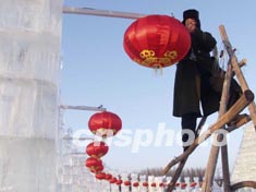 長春凈月潭冰雪旅游節將于二零零三年元月三日開幕,大紅燈籠高掛在晶瑩剔透的冰雕上。作者:韓丹