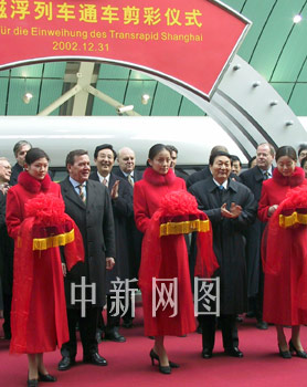 三十一日,世界第一條磁浮商業(yè)示范運(yùn)營(yíng)線(xiàn)——上海磁浮列車(chē)線(xiàn)在滬通車(chē),中國(guó)總理朱镕基與德國(guó)總理施羅德參加通車(chē)典禮并試乘了首發(fā)列車(chē)。圖為中德兩國(guó)總理在龍陽(yáng)路車(chē)站為上海磁浮列車(chē)通車(chē)剪彩。中新社 王健 攝