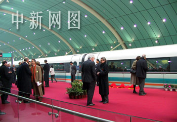 三十一日,世界首條磁浮商業(yè)示范運(yùn)營(yíng)線(xiàn)——上海磁浮列車(chē)線(xiàn)在滬通車(chē)。眾多中外來(lái)賓參加了今天在滬舉行的通車(chē)儀式。圖為來(lái)賓們?cè)谡九_(tái)等待乘坐首列磁浮列車(chē)。中新社 王健 攝