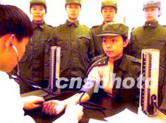 北京解放軍某部八日對新兵進(jìn)行身體復(fù)查,不合格者退回原籍。解放軍部隊(duì)每年都要對新入伍的戰(zhàn)士按照體格標(biāo)準(zhǔn)進(jìn)行全面復(fù)查身體,以確保士兵體格健壯。作者:宋吉河
