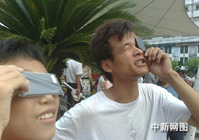 22日上午,500年一遇的日全食天文奇觀讓整個宜賓縣沸騰了,老老小小,男男女女都跑出來觀看。記者在現場看到,有戴著墨鏡觀看的,有拿望遠鏡觀看的,有用焊工專用鏡觀看的,有拿茶葉包裝紙觀看的,有人用照相機照著相,有人用著攝像機……廣場上、院子里、壩壩頭到處站滿了人,大家都擠在一起驚嘆著:“看,太陽慢慢變小了,成月亮了,只有光圈了,天黑了……”