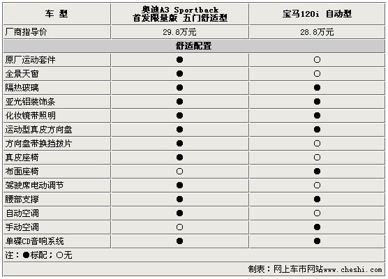 在舒適配置方面,入門的寶馬120i可能會(huì)讓你失望,常見的真皮座椅以及自動(dòng)空調(diào)在這款“純運(yùn)動(dòng)”的車型身上均找不到。而相比之下奧迪A3 Sportback首發(fā)限量版就顯得更豪華了,這款新車裝配了部分奧迪原廠的“S-Line”運(yùn)動(dòng)套件,不僅視覺(jué)效果更運(yùn)動(dòng),配置也提升了一個(gè)檔次。