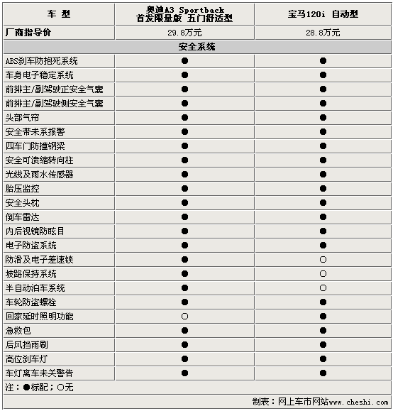 作為高品質(zhì)的德系緊湊型兩廂運(yùn)動(dòng)小車,兩款車型在安全性方面均體現(xiàn)了很高的水準(zhǔn)。除了在這個(gè)級(jí)別中常見的前排正/側(cè)以及頭部安全氣簾外,奧迪A3 Sportback首發(fā)限量版在安全方面的配置要高于寶馬120i,也顯得更為豐富周全。奧迪A3 Sportback首發(fā)限量版所配備的:防滑電子差速鎖、坡路保持以及半自動(dòng)泊車系統(tǒng)是既安全又實(shí)用的配置。