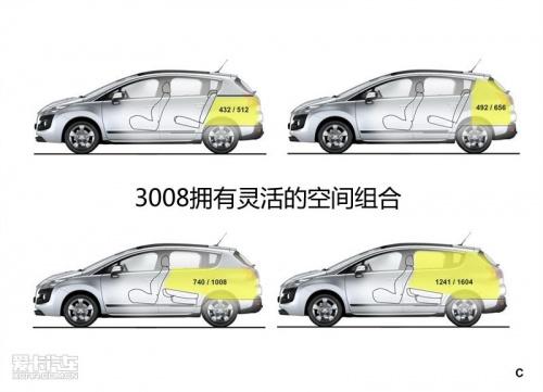 不過(guò)3008在空間的利用上非常出色,6/4分離的座椅設(shè)計(jì)可使得行李箱容積由512升擴(kuò)充至1604升,另外擁有多種空間組合。