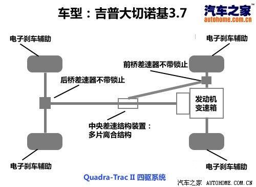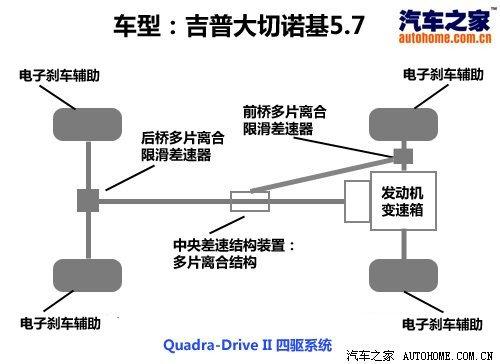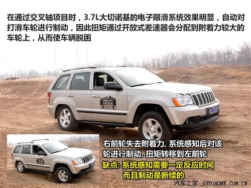 大切諾基采用前后整體橋的非獨立懸掛,這在結構在本身上也偏重越野。進入國內的大切諾基有兩款車型,排量分別為3.7升和5.7升,兩款車型采用的四驅結構并不相同,主要體現在3.7升車型前后軸上沒有差速鎖,盡管它的電子輔助系統也足夠強大,但在通過一些難度較大的交叉軸項目時,電子輔助還是比機械結合反應緩慢一些。